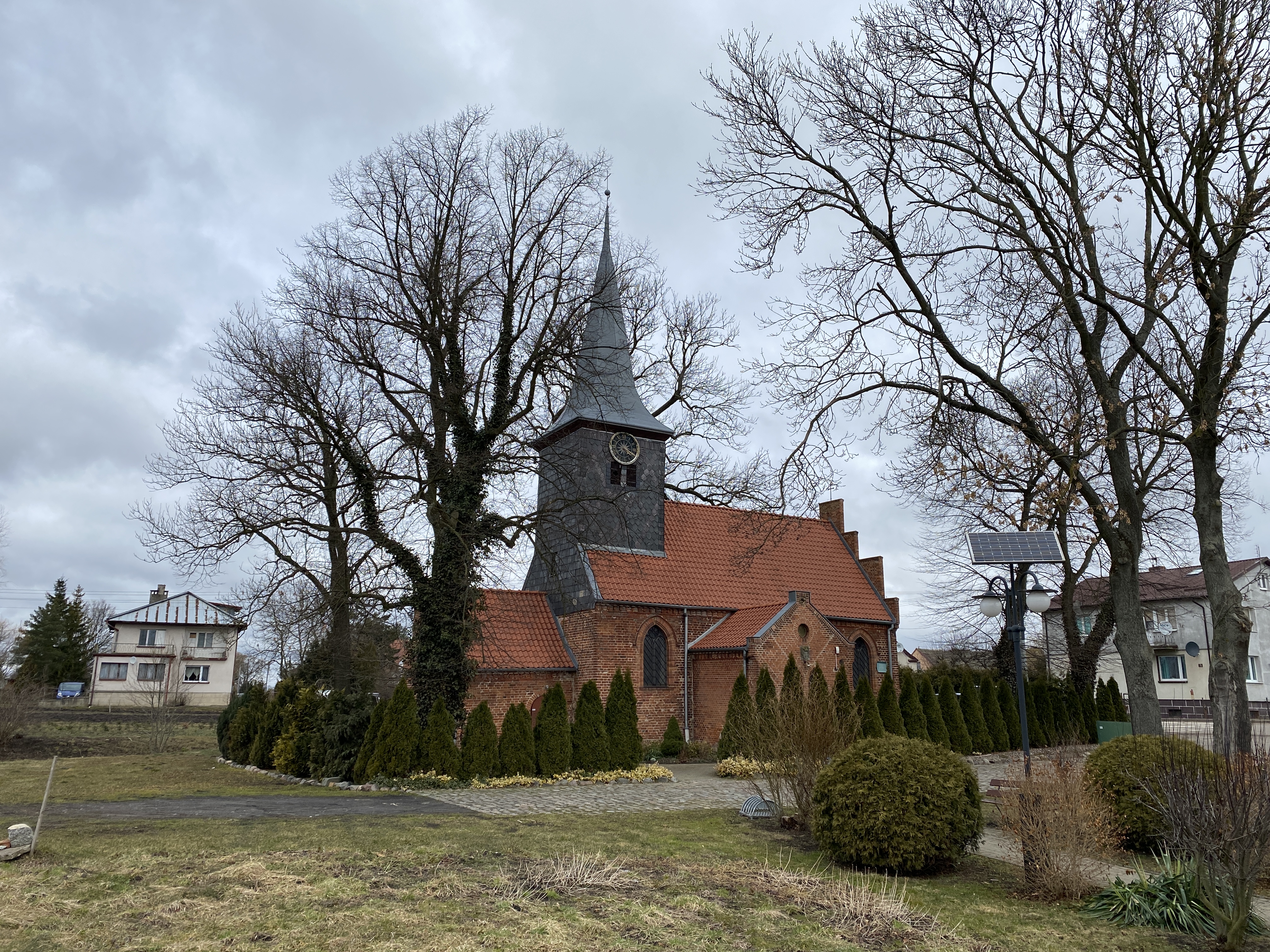 Świątynia została wzniesiona w XIV w., a w XVII gruntownie przebudowana. Jest to jednonawowa budowla z dobudowaną w XVIII w. drewnianą wieżą zakończoną strzelistym hełmem oraz XIX- wieczną kaplicą południową. W murach kościoła znajdują się kamienne kule armatnie, które są pamiątka po prowadzonych na tym terenie bitwach w czasie wojen szwedzkich. Nad wejściem do kruchty zauważyć można herb Gdańska umiejscowiony na tarczy owiniętej wieńcem z liści. Miasto Gdańsk było przez kilka wieków patronem parafii.